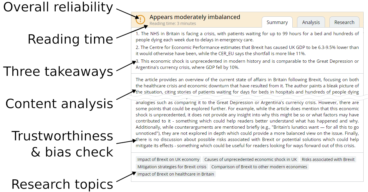 Full Picture offers a comprehensive assessment of any text you read. It summarizes the text in three bullet points, checks for unsupported claims, biases, and other potential risks, and assigns a rating of reliability. It also provides six search keywords to use in Google to find more information that the article is lacking or misrepresenting. With this service, you can quickly gain a better understanding of the text.