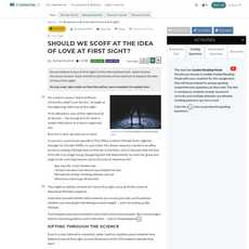 The article "Should we scoff at the idea of love at first sight?" by James Kuzner is an interesting exploration of the concept of love at first sight from both scientific and literary perspectives. The article is well-written and provides a comprehensive overview of the topic, including surveys, brain science studies, and examples from Shakespeare's Romeo and Juliet.