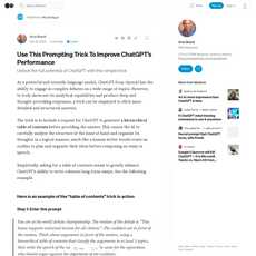 1. The article discusses a trick to improve ChatGPT's performance by prompting it to generate a hierarchical table of contents before providing an answer.