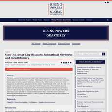 The article “Sino-U.S. Sister City Relations: Subnational Networks and Paradiplomacy - Rising Powers in Global Governance” provides an interesting perspective on the role of subnational actors in global governance through their involvement in sister city relationships between China and the United States. The article is well written and provides an overview of the history of Sino-U.S relations as well as an analysis of how these relationships have impacted conflict prevention, human rights protection, capacity building, climate action, trust building, local politics during times of national turmoil, public administration development areas, environmental protection cooperation, etc.