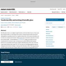 该文章是一篇关于金属玻璃的拉伸延展性和颈缩现象的研究。文章指出,与晶体金属相比,单质金属玻璃在室温下几乎没有可观察到的拉伸应变,并且塑性通常是高度不均匀的。然而,在小体积金属玻璃中,可以观察到与具有延展性的晶体金属相同的行为,包括均匀延伸、颈缩和稳定剪切。