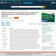 The article “Obstacle Avoidance and Tracking Control of Redundant Robotic Manipulator: An RNN-Based Metaheuristic Approach” provides an overview of a metaheuristic-based control framework for simultaneous tracking control and obstacle avoidance of a redundant manipulator. The authors present their proposed approach as an efficient solution to the problem of controlling robotic manipulators in complex environments with obstacles present in the environment.