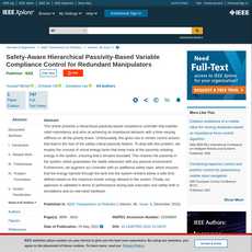 The article “Safety-Aware Hierarchical Passivity-Based Variable Compliance Control for Redundant Manipulators” provides a comprehensive overview of a hierarchical passivity-based compliance controller that exploits robot redundancy and aims at achieving an impedance behavior with a time-varying stiffness on all the priority levels. The authors present two solutions to ensure safety by using energy tanks to preserve passivity in the system, either by choosing an initial tank energy based on the maximum allowed kinetic energy or by limiting the power injected into the system from nonpassive control actions.
