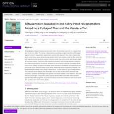 1. 提出了一种基于C形光纤和Vernier效应的超灵敏级联内联法布里-珀罗折射计。该传感器由串联单模光纤(SMF)引线、C形光纤段和另一个SMF段组成。C形光纤构成一个开放腔体(感应腔体),可以填充测试样品,而SMF段则构成另一个参考腔体。由于这两个腔体的光程相似,激活了Vernier效应,在传感器的反射谱中形成了光谱包络。样品的折射率变化会导致光谱包络的偏移。