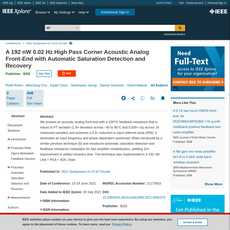 The article presents an acoustic analog front-end with a 100TΩ feedback resistance that is robust to PT variation and achieves a 3.3× reduction in input referred noise (IRN). The article claims that the technique eliminates an input frequency and phase dependent systematic offset introduced by a similar previous technique [5] and introduces automatic saturation detection and feedback resistance modulation for fast amplifier restabilization, yielding 10× improvement in artifact recovery time. The article also leverages a "sample and average" feedback structure to achieve TΩ resistance in a PT robust manner while eliminating phase dependent sampling bias.
