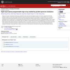 这篇文章介绍了一种基于光谱调制的可编程逻辑阵列(PLA),可以支持多达八个输入。作者声称通过充分利用波长资源,可以实现256个逻辑门的组合。他们还展示了通过利用该PLA实现的各种复杂逻辑功能,如8-256解码器、4位比较器、加法器和乘法器。此外,作者还提到他们成功实现了一个九输入的PLA,用于实现二维光学元胞自动机,并模拟细胞的进化过程。