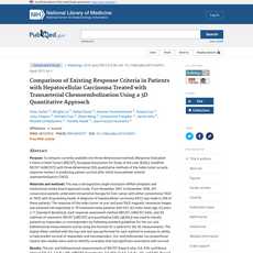 1. This study compared existing response criteria in patients with hepatocellular carcinoma (HCC) treated with transarterial chemoembolization (TACE) using a 3D quantitative approach.