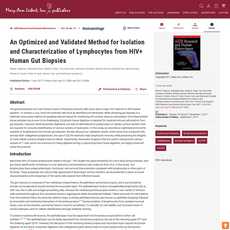 The article provides a detailed description of an optimized method for isolating lymphocytes from HIV+ human gut biopsies for AIDS research and human retroviruses. The authors provide a comprehensive overview of the process, including key factors to consider such as cell yield, cell viability, and preservation of surface epitopes used for cellular identification through antibody staining. They also discuss various types of collagenase that can be used for tissue digestion, as well as potential effects on cell viability and surface marker expression.
