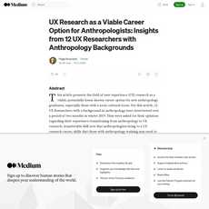 1. UX research is a viable career option for anthropology graduates: The article highlights the potential for anthropology graduates, particularly those with a socio-cultural focus, to pursue a career in user experience (UX) research. It presents insights from 12 UX researchers with backgrounds in anthropology who discuss their experiences transitioning from anthropology to UX research.