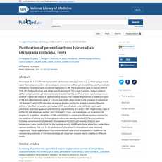 1. A three-step procedure was used to purify peroxidase from horseradish (Armoracia rusticana) roots, resulting in an overall yield of 71%, 291-fold purification, and a high specific activity of 772 U mg(-1) protein.