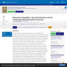 The article “Separatist biopolitics: the dual discourse of the vocational education policy in Israel” provides an interesting insight into the current state of vocational education policy in Israel. The article is well researched and provides a comprehensive overview of the topic, including a review of written government materials such as protocols of Israeli Parliamentary (IP) committees; reports submitted to the Israeli Parliament Research and Information Centre; and the Ministry of Education website. The article also includes a discussion section which explores the implications of this educational policy in terms of separatist biopolitics (Foucault Citation2008) for population management, as well as its ramifications for maintaining inequality in vocational education since 1948.