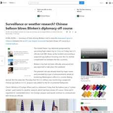 1. Secretary of State Antony Blinken's upcoming trip to China is complicated by the discovery of a Chinese balloon in U.S. airspace, which Beijing claims is for weather research.