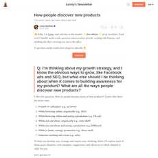 O artigo How People Discover New Products - by Lenny Rachitsky oferece informações úteis sobre como as pessoas descobrem novos produtos. O autor apresenta sete canais principais de descoberta de produtos: amigos ou colegas (por exemplo, convite), enquanto navega na internet organicamente (por exemplo, SEO), enquanto navega na internet e vê uma promoção (por exemplo, anúncios do Facebook), enquanto sai por aí organicamente (por exemplo, prateleira da loja), enquanto sai por aí e vê uma promoção (por exemplo, outdoors) , Enquanto estiver em casa vendo uma promoção (por exemplo, correspondência direta) ou alguém entrar em contato com você (por exemplo, vendas).