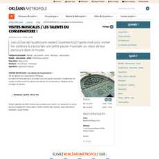 L'article présente une annonce pour des visites musicales organisées par le Conservatoire d'Orléans au musée. Il informe les lecteurs que les élèves du conservatoire se produiront à l'auditorium du musée et invite les visiteurs à assister aux concerts gratuits qui auront lieu le dimanche 2 avril.