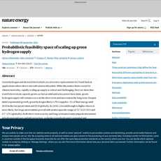 The article “Probabilistic feasibility space of scaling up green hydrogen supply” published in Nature Energy provides an analysis of the potential deployment of electrolysis capacity for green hydrogen production by combining an S-shaped logistic technology diffusion model with a probabilistic parameterization based on data from established successful energy technologies. The article is well written and provides a comprehensive overview of the current state of green hydrogen supply and its potential for climate change mitigation.